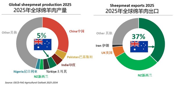 澳大利亚在全球绵羊肉出口贸易中扮演着重要角色,根据经济合作与发展组织(OECD)与联合国粮食及农业组织(FAO)的数据,2025年澳洲绵羊肉出口约占全球37%的份额。澳大利亚农业、渔业和林业部(DAFF)的数据显示,2025年,澳洲羔羊肉出口至中国大陆约6.3万吨,占全球出口量18%左右;成羊肉出口至中国大陆5.6万吨,约占全球的26%。这些羔羊肉和成羊肉不但有冰鲜肉和冷冻肉的划分,还有胸腹肉、羊腿、羊肩等十余种部位的划分,由此一方面契合了不同级别市场的需要,另一方面兼顾了中西餐烹饪特点。